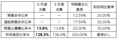 『地方公共団体の財政の健全化に関する法律』に基づく健全化判断比率は警戒ラインとなる早期健全化基準を下回りました。