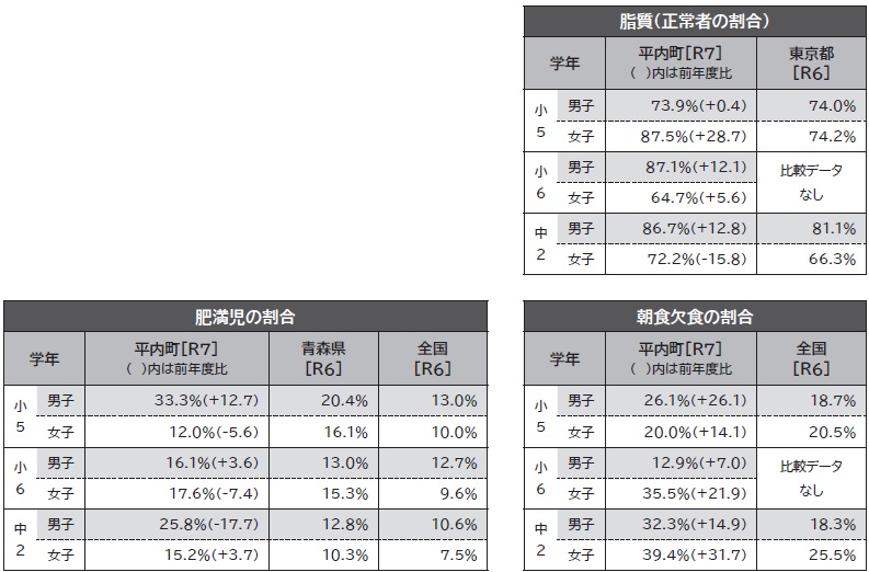 脂質の正常者は全体的に増加。肥満は小5男子と中2男子が特に高い傾向でした。朝食欠食は全学年で増え、全国より高い結果となりました。