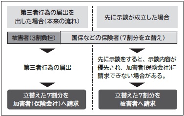 加害者との話し合いで示談が成立すると、示談の内容が優先され、国民健康保険や後期高齢者医療保険が立て替えた医療費について、加害者への請求できなくなることがあります。その場合は、被害者へ請求することになりますのでご注意ください。示談をする場合は、必ず事前に役場 健康増進課へご連絡ください。