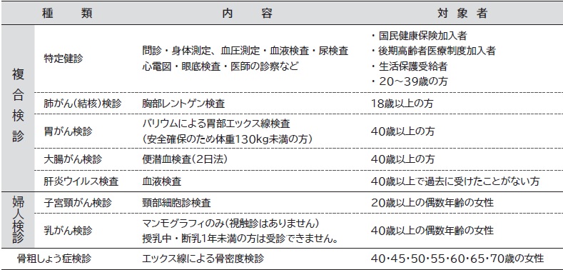 集団検診の日程が合わず受けられなかった方や、まだ健診を受けていない方を対象に、11月から3月まで下記の日程で実施します。がん検診と同時に無料で受けることができます。40歳未満の方も、若いうちから健診を受けて自分の健康状態を把握することで、日頃の生活を見直すきっかけとなり、病気の予防や早期発見・治療につながります。まだ受けていない方は、ぜひお申し込みください。