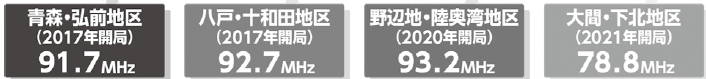 青森放送のFM局は、青森・弘前地区(91.7MHz)、八戸・十和田地区(92.7MHz)、野辺地・陸奥湾地区(93.2MHz)、大間・下北地区(78.8MHz)でお聴きいただけます。