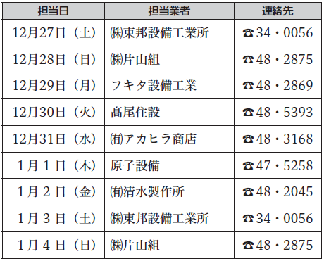 令和7年12月27日(土)から令和8年1月4日(日)までの間、水道の凍結による漏水等のトラブルは以下の業者が対応いたします。修理のご依頼や、何かお困りの場合は、担当業者に直接お問い合わせください。