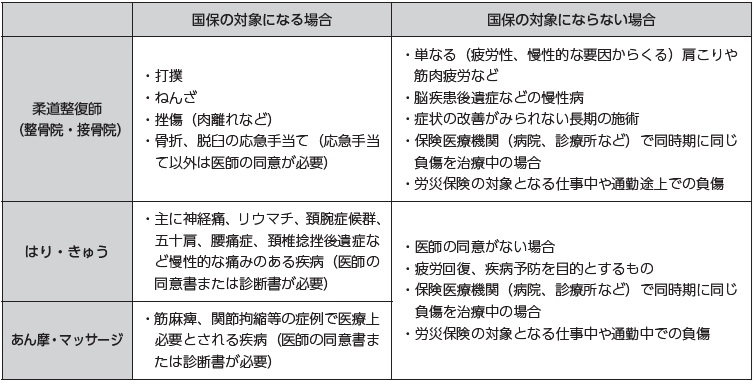 柔道整復師・はり・きゅう・あん摩マッサージによる施術は、その負傷原因や症状などによって、国保の対象になる場合とならない場合があります。国保の対象にならない場合は、全額自己負担になることがありますので、施術を受ける前に施術師とよく相談しましょう。