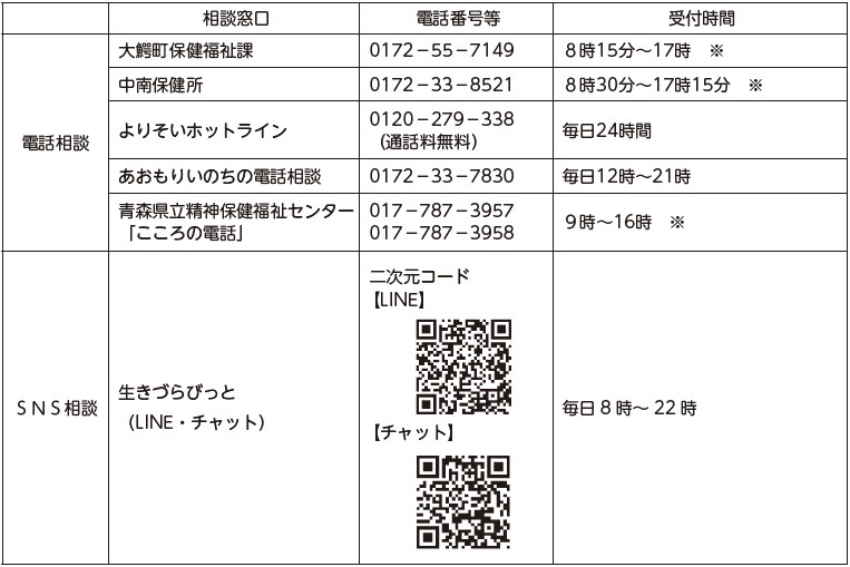 自殺は、様々な悩みや問題を一人で抱えるうちに心理的に追い込まれた状態で起こるといわれています。一人で悩みを抱え込まず、困ったら身近な人や相談窓口に早めに相談しましょう。また、身近な人が悩んでいることに気づいたら、声をかけ、ゆっくり話を聴き、専門窓口への相談を勧めてください。