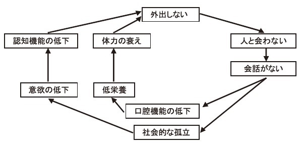 介護予防の目的は、自立した生活を維持し健康寿命を延ばすことです。高齢期を自分らしく、楽しく生活するために今からできることをはじめましょう。今回は「人とのつながり」「社会参加」についてです。外出の機会を増やすと人や社会とのつながりが生まれ、心身の機能が向上します。逆に閉じこもってばかりいると、下の図のように悪循環となりフレイル(健康と要介護の中間の状態)が進み介護状態に近づきます。