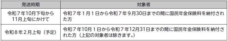 日本年金機構より「社会保険料(国民年金保険料)控除証明書」が対象者宛に発送されています。お手元に届きましたら、年末調整や確定申告の際にご利用ください。送付スケジュールは次の通りです。