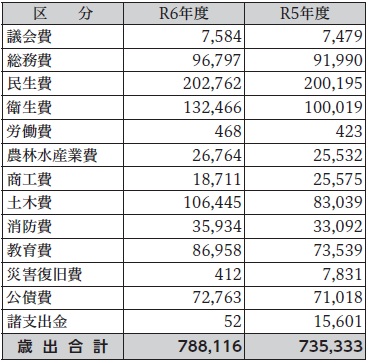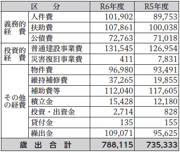 支出を性質別に区分したもので、支出が義務付けられる経費(義務的経費)、公共施設等の建設や災害復旧に係る経費(投資的経費)、その他の経費に区分しております。歳出合計は788,115円となっております。