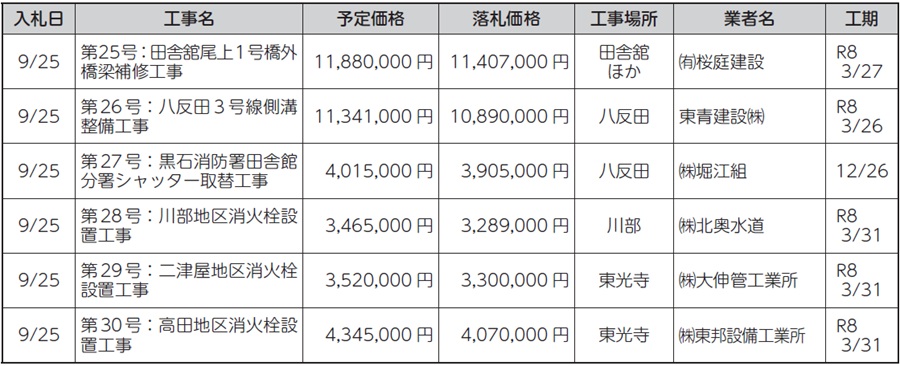 詳細は役場2階総務課と村のホームページで公表しています。予定価格と落札価格は消費税等込みの額です。