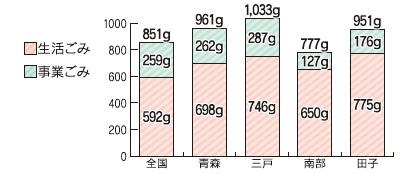 三戸町のごみの排出量は、青森県内でも11番目に多く、全国平均や青森県平均と比較すると100グラム~200グラム多い状況となっています。(令和5年度一般廃棄物処理事業実態調査(環境省)より)