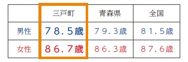「人生100年時代」と言われる昨今、三戸町の平均寿命は、男女とも全国平均に比べると短命となっています。町の令和2年の平均寿命は、男性が県内順位で36位(全国ワースト8位)となっています。女性は県内順位5位となっていますが、全国平均を下回っています。男女差は、8.2歳で県内で1番大きくなっています。