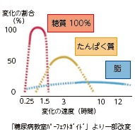 ○主食に多く含まれる炭水化物は、ほぼ100%ブドウ糖に変換されるため、血糖値に大きく影響します。血糖値を上げやすい主食(ごはん、パン)だけに片寄らず、血糖値を上げにくい野菜や肉、魚料理も一緒に食べましょう。