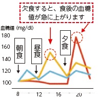 ○食事を抜いて体が飢餓状態になると、体は血糖値をため込もうとして血糖値が高くなります。食事は1日3食規則正しい時間に食べましょう。