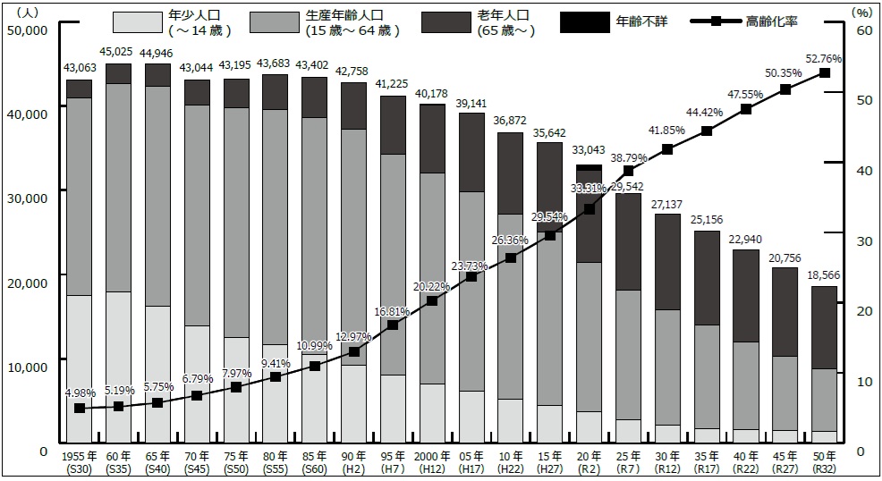 人口減少の加速と併せ、もう一つの大きな問題は、高齢化率の上昇です。昭和30年の高齢化率は約5%でしたが、令和2年は約33%。65年間で約28ポイント上昇しています。今後もこの傾向は続くと見込まれ、令和32年には約53%、2人に1人が65歳以上となる予測となっています。