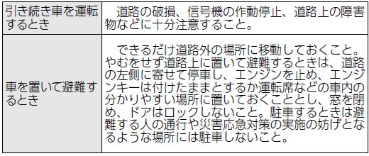 自動車による避難は、迅速に避難できますが、道路の破損や渋滞の発生などにより避難ができない可能性もあります。国家公安委員会の「交通の方法に関する教訓」では、大地震が発生したときの運転者の措置について、左の表のように示しています。冷静な避難行動が取れるよう考えておくことが大切です。