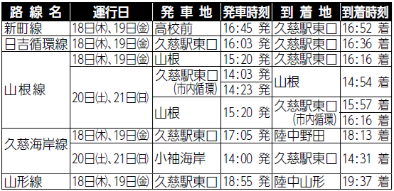 白樺号・スワロー号、岩手きずな号、久慈こはく号、久慈大野線の乗降場も変更になります。規制がかかる市民バスは左表の通りです。詳しくは問い合わせください。