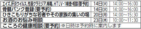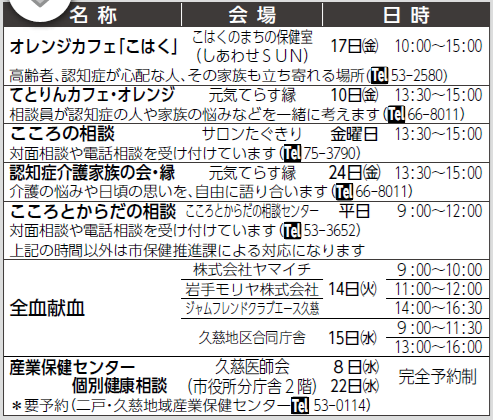 健康 健康相談・検査 10/17 前の記事 次の記事 発行日 : 2025年09月15日 自治体名 : 岩手県久慈市 広報紙名 : 広報くじ 令和7年9月15日号 No.469 会場:久慈保健所(久慈地区合同庁舎) 問合せ:久慈保健所 【電話】53-4987 Tweet シェアする 年金相談(要予約) 税などの納期