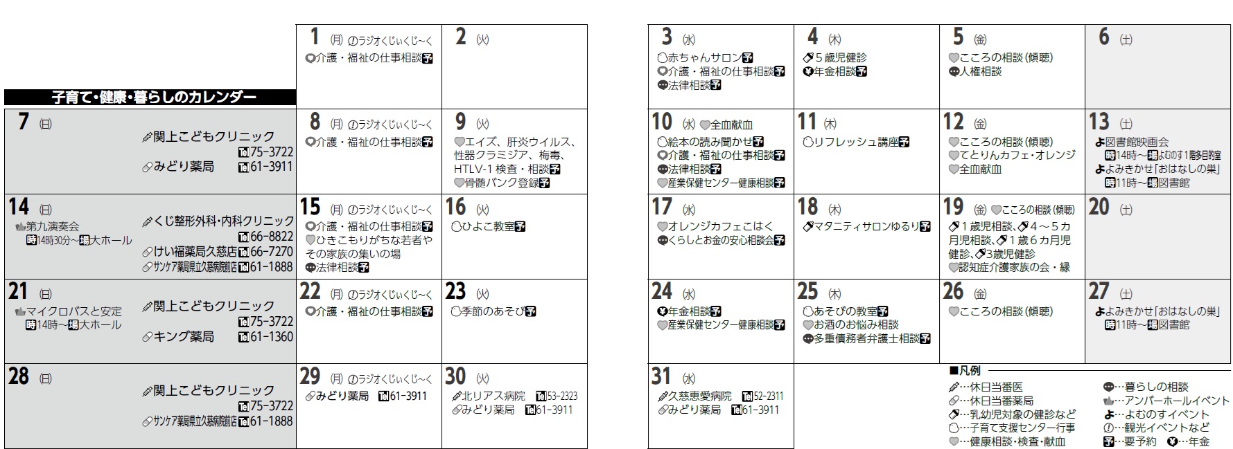 くらし 子育て・健康・暮らしのカレンダー11月 5/18 前の記事 次の記事 発行日 : 2025年11月15日 自治体名 : 岩手県久慈市 広報紙名 : 広報くじ 令和7年11月15日号 No.473 Tweet シェアする 宝くじ助成金で備品を整備 国民健康保険山形診療所の外来診療