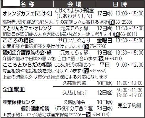 健康 健康相談・検査 12/18 前の記事 次の記事 発行日 : 2025年11月15日 自治体名 : 岩手県久慈市 広報紙名 : 広報くじ 令和7年11月15日号 No.473 会場所:久慈保健所(久慈地区合同庁舎) 問合せ:久慈保健所 【電話】53-4987 Tweet シェアする 介護・福祉の仕事相談(要予約) 暮らしの相談