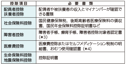 各種控除を適用する人は下の表の書類を用意してください