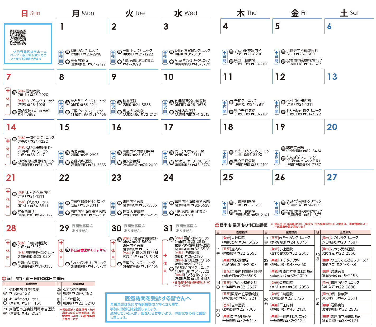(1)当番医は変更になることがあります。電話で確認してから受診してください。