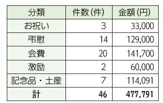 本年4月から9月までの市長交際費は左の表のとおりです。合計は、46件で47万7,791円でした。