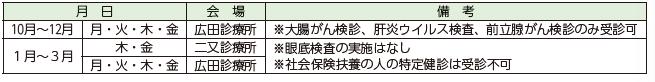 10月1日(水)から実施する健診について、次のとおり日程をお知らせします。自身の健康管理のために、積極的に受診しましょう。