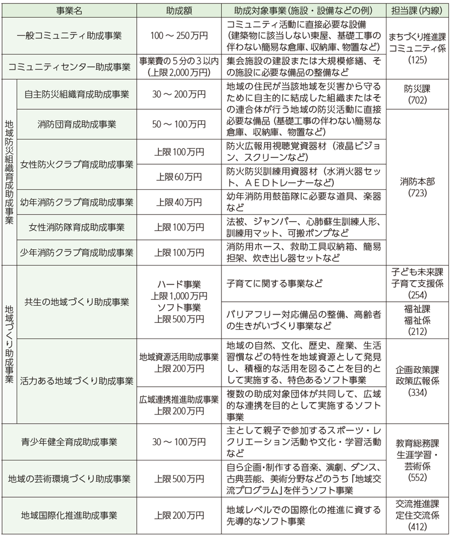 (自主防災組織育成助成事業は10月9日(木)、地域の芸術環境づくり助成事業は10月24日(金)、地域国際化推進助成事業は10月17日(金))