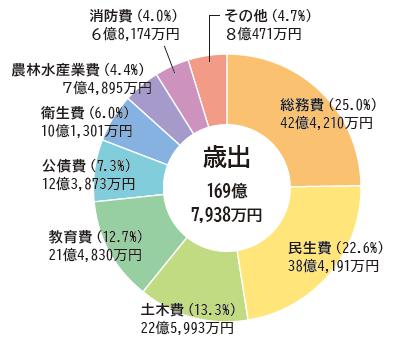 一般会計は、復旧・復興事業費などの減少により、対前年度比で歳入が5.3%、歳出が4.3%の減となりました。歳入の構成比は主に地方交付税が30.6%と最も高く、以下、国庫支出金13.7%、繰入金13.5%となりました。歳出の構成比は総務費が25.0%と最も高く、以下、民生費22.6%、土木費13.3%となりました。