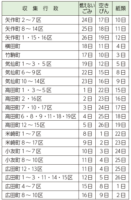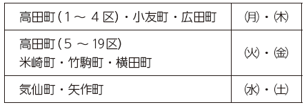 ◇燃えるごみの収集日 ※祝日の場合、収集はありません。