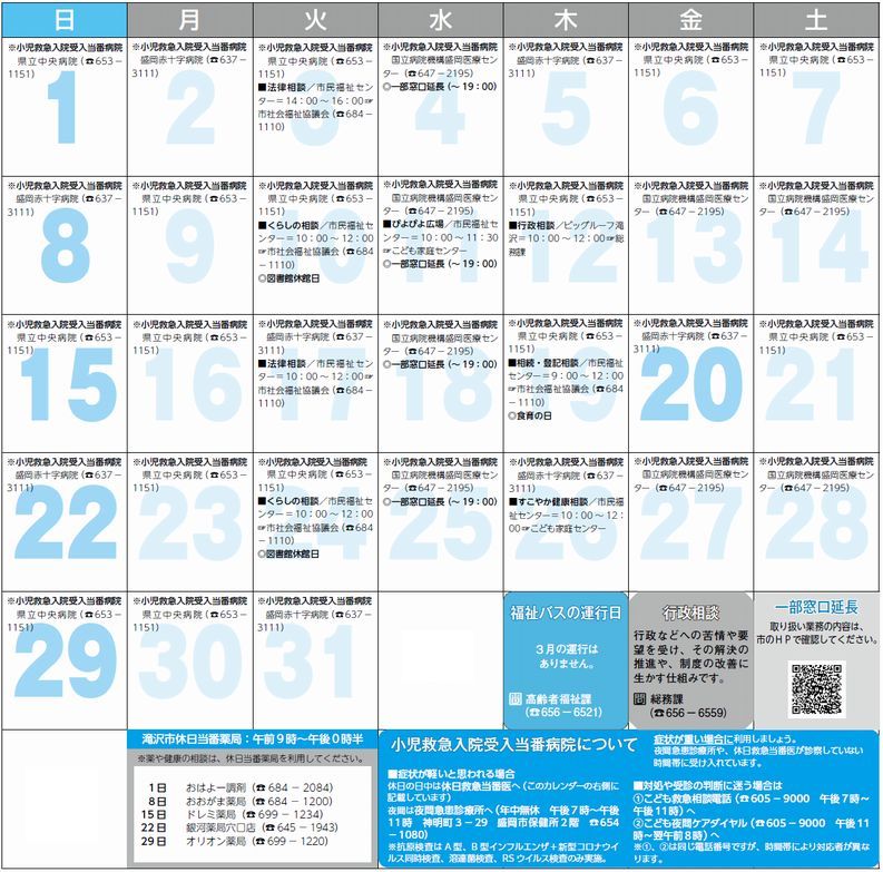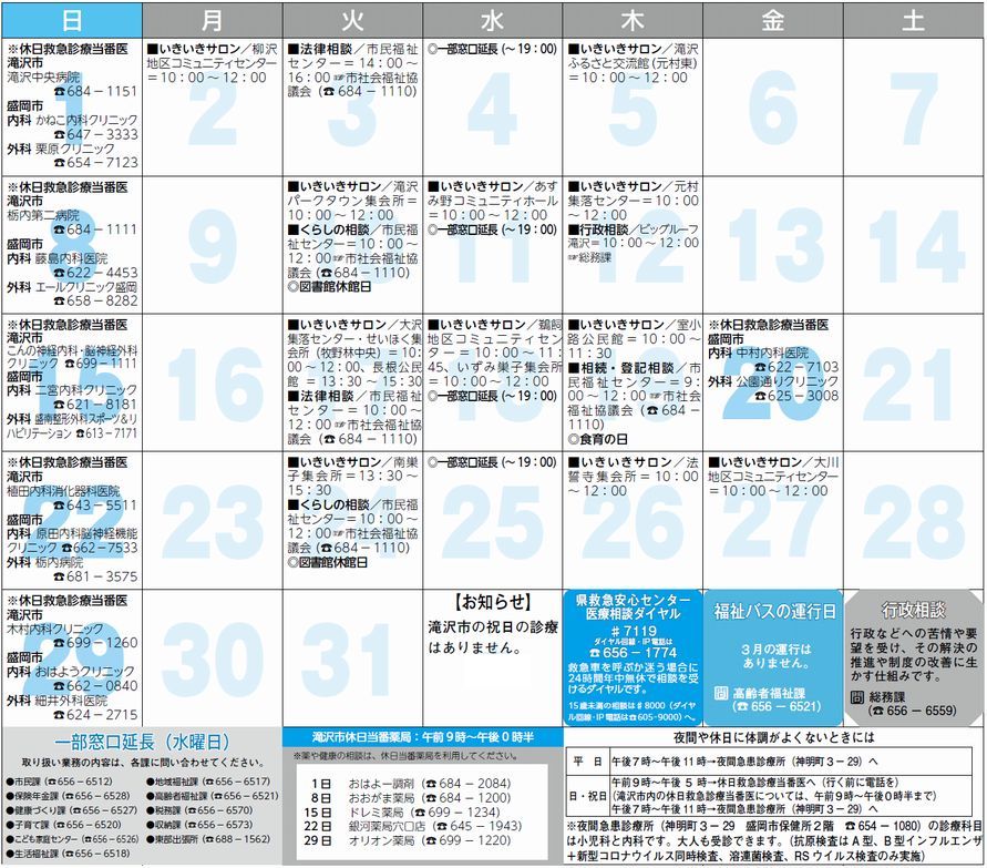 くらし 3月のカレンダー 7/12 前の記事 次の記事 発行日 : 2026年02月15日 自治体名 : 岩手県滝沢市 広報紙名 : 広報たきざわ 令和8年2月15日号 Tweet シェアする くらしのダイヤルー相談ー 移動図書館車~かっこう号運行日程