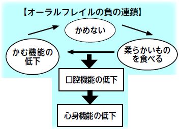 オーラルフレイルとは、簡単にいうと「口腔の虚弱」です。滑舌の低下、食べこぼしや、むせ、かめない食品が増えるなど、口に関する「ささいな衰え」が積み重なった状態です。