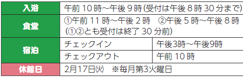 くらし 国民保養センター 20/29 前の記事 次の記事 発行日 : 2026年02月01日 自治体名 : 岩手県矢巾町 広報紙名 : 広報やはば 令和8年2月号 ■[2月]お得な入浴料金 ■営業時間など ※その他イベントなど、詳しくは本紙をご覧ください。 問合せ:国民保養センター 煙山1-5 【電話】019-697-2310 Tweet シェアする 矢巾町社会福祉協議会 やはぱーく