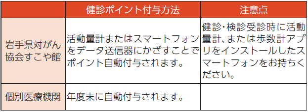 令和7年度特定健診・がん検診などを受診される方に健診ポイントをプレゼントします。健診・検診実施機関により付与の方法が異なりますので、詳細は表をご覧ください。やはば健康チャレンジ事業の詳細は町ホームページをご確認ください。