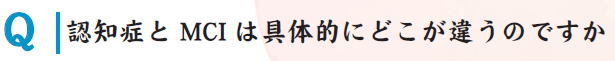 A:大まかに、日常生活に支障があるか否か。MCIが進行すると認知症を発症する可能性があり、認知症の前段階と考えられます。