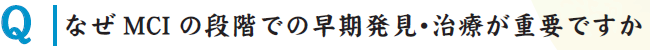 A:MCIは認知機能障害の分岐路です。この状態で早期に発見・予防的な取り組みを開始すれば、進行を抑制・遅延できる可能性があります。