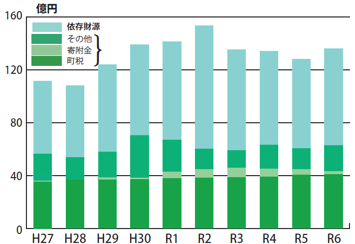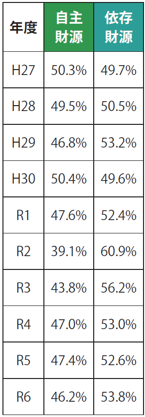 町税は定額減税の影響で町民税が減収となったものの、固定資産税および軽自動車税などが増収となったことにより、前年度比約5,300万円増加し、高い数値を維持しています。町債は令和5年度から繰り越した公共事業にかかる経費が増となったため、前年度比約1億500万円増加しました。国庫支出金はデジタル基盤改革支援補助金などが増となったことから、前年度比約2億6,200万円の増となりました。自主財源と依存財源の割合は、自主財源比率が46.2%で前年度比1.2ポイント減少。依存財源比率は53.8%で1.2ポイント増加。近年は依存財源比率が高い傾向にあります。