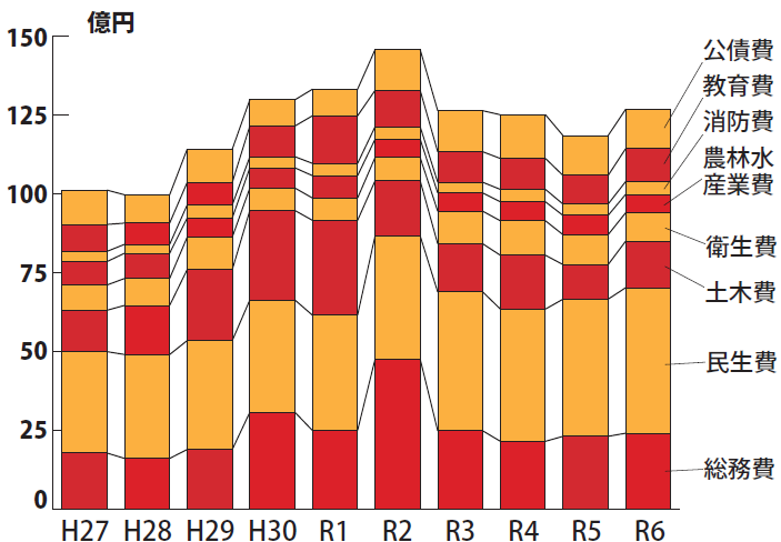 土木費は防災安全対策事業や道路維持管理事業などにより約3億8,000万円増加しました。民生費は障害者自立支援事業や低所得者支援および定額減税補足給付金事業などにより約2億7,000万円増加しました。衛生費は新型コロナウイルスワクチン接種に係る事業の減により約4,700万円減少しました。