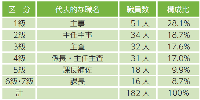 職員に適用される給料の級は、経験年数や責任の度合いにより区分されています。上記以外の労務職については、1級から4級に区分されています。