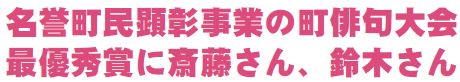 名誉町民・小原葉氏の顕彰事業である町俳句大会の表彰式を10月19日の秋まつり内で実施。県内外から一般、中学・高校生の部を併せて192人365句の応募がありました。受賞者は次のとおりです。