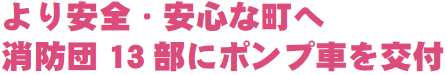 町消防団第13部へ、消防ポンプ車1台を交付しました。9月26日、町役場で交付式を実施。谷村謙一消防団長へ高橋町長から交付証を授与しました。町では平成23年度から、町消防団各部の消防ポンプ車の更新を進めており、今回の交付で全13部の更新が完了しました。