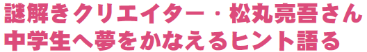 町青少年健全育成町民会議の特別講演が10月14日、田園ホールで行われました。謎解きクリエイターとして活躍中の松丸亮吾さんが、参加した町内中学生約700人を前に講演。