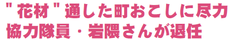 令和4年10月から町地域おこし協力隊の一員として活動した岩隈淳樹さんが9月30日、任期を終え退任しました。同日、町役場で退任式を行い、高橋町長が感謝状を贈り3年間の活躍を称え、ねぎらいました。岩隈さんは首都圏で花材を取り扱う業務を経験したことを生かし、町内の資源を活用したワークショップやフラワーアレンジメント教室の開催、農業者支援などを行いました。