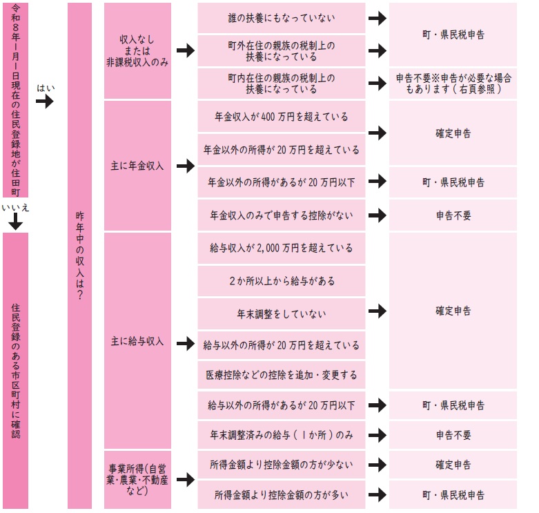 申告の要否と申告の種類(所得税の確定申告、町・県民税申告)を下の図で確認できます。