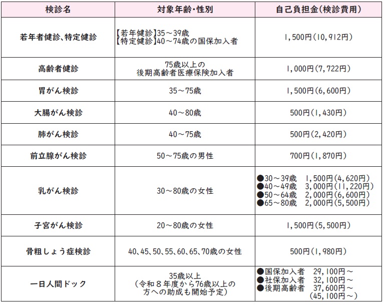 町が実施するがん検診は、通常の検査料金よりも安く受けることができます。対象年齢や自己負担金額は下表のとおりです。(※料金については、変更となる場合があります。)