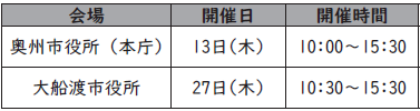 一関年金事務所では、下表のとおり相談会を開催します。予約制のため、相談を希望する方は開催日の前日までにお申込みください。