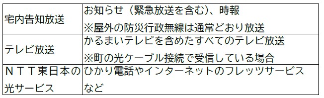 光ケーブルの移設工事のため、12月22日と23日、一部の地区でかるまいテレビなどのテレビ放送や宅内告知放送のほか、ひかり電話やフレッツサービスなど、NTT東日本の光サービスが一時的に利用できなくなります。