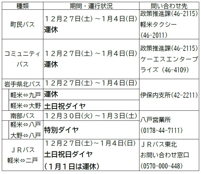 くらし 年末年始のバスの運行 3/20 前の記事 次の記事 発行日 : 2025年12月24日 自治体名 : 岩手県軽米町 広報紙名 : 広報かるまい お知らせ版 501号 (令和7年12月24日発行) 年末年始期間のバスの運行は、下記のとおりとなります。 ※高速バス八盛号(軽米⇔盛岡行)とシリウス号(軽米⇔東京、要予約)は運行します。 問い合わせ先:政策推進課 【電話】46-2115 Tweet シェアする テレビ・告知放送の休止のお知らせ 元旦マラソン参加者募集