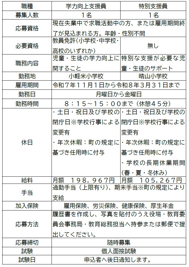 現在、町内の各小学校では、子ども達の学びを助ける支援員が不足しています。