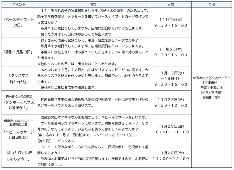 子育て [宇漢米館]子育て支援広場(ピヨピヨ広場)イベントのお知らせ 10/20 前の記事 次の記事 発行日 : 2025年10月22日 自治体名 : 岩手県軽米町 広報紙名 : 広報かるまい お知らせ版 497号 (令和7年10月22日発行) 問い合わせ先: かるまい文化交流センター宇漢米館内ピヨピヨ広場【電話】26-8250(内線144) 健康福祉課・福祉担当【電話】46-4736 Tweet シェアする 岩手県の最低賃金が改正されます かるまい文化交流センター宇漢米館の11月休館日