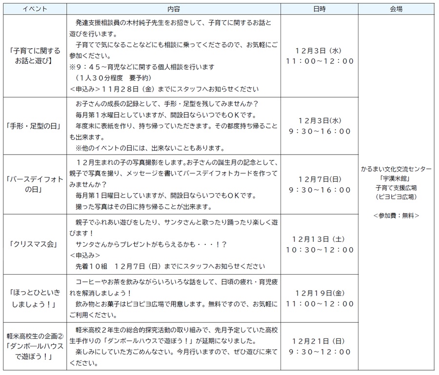 子育て [宇漢米館]子育て支援広場(ピヨピヨ広場)イベントのお知らせ 5/18 前の記事 次の記事 発行日 : 2025年11月26日 自治体名 : 岩手県軽米町 広報紙名 : 広報かるまい お知らせ版 499号 (令和7年11月26日発行) 問い合わせ先: かるまい文化交流センター宇漢米館内ピヨピヨ広場【電話】26-8250(内線144) 健康福祉課・福祉担当【電話】46-4736 Tweet シェアする 二戸地域障がい者就職相談会を開催します ピヨピヨ広場お休みのお知らせ